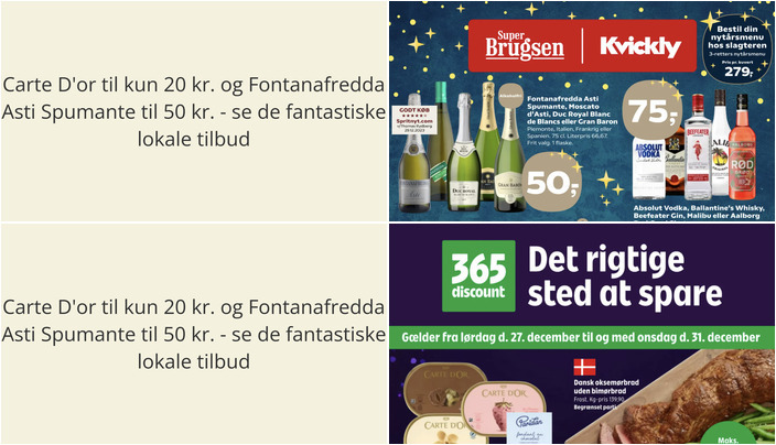SuperBrugsen har et godt tilbud på Fontanafredda Asti Spumante, Moscato d'Asti, Duc Royal Blanc de Blancs eller Gran Baron. Du kan få frit valg af én flaske til kun 50 kr. Tilbuddet gælder fra lørdag den 27. december til onsdag den 31. december.